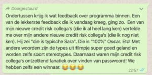 - Het is een mix van zwaar en licht. De opdrachten gaan echt ergens over- maar er mag ook gelachen worden, waardering worden uitgesproken en gewezen worden op dat wat goed gaat in de organisatie