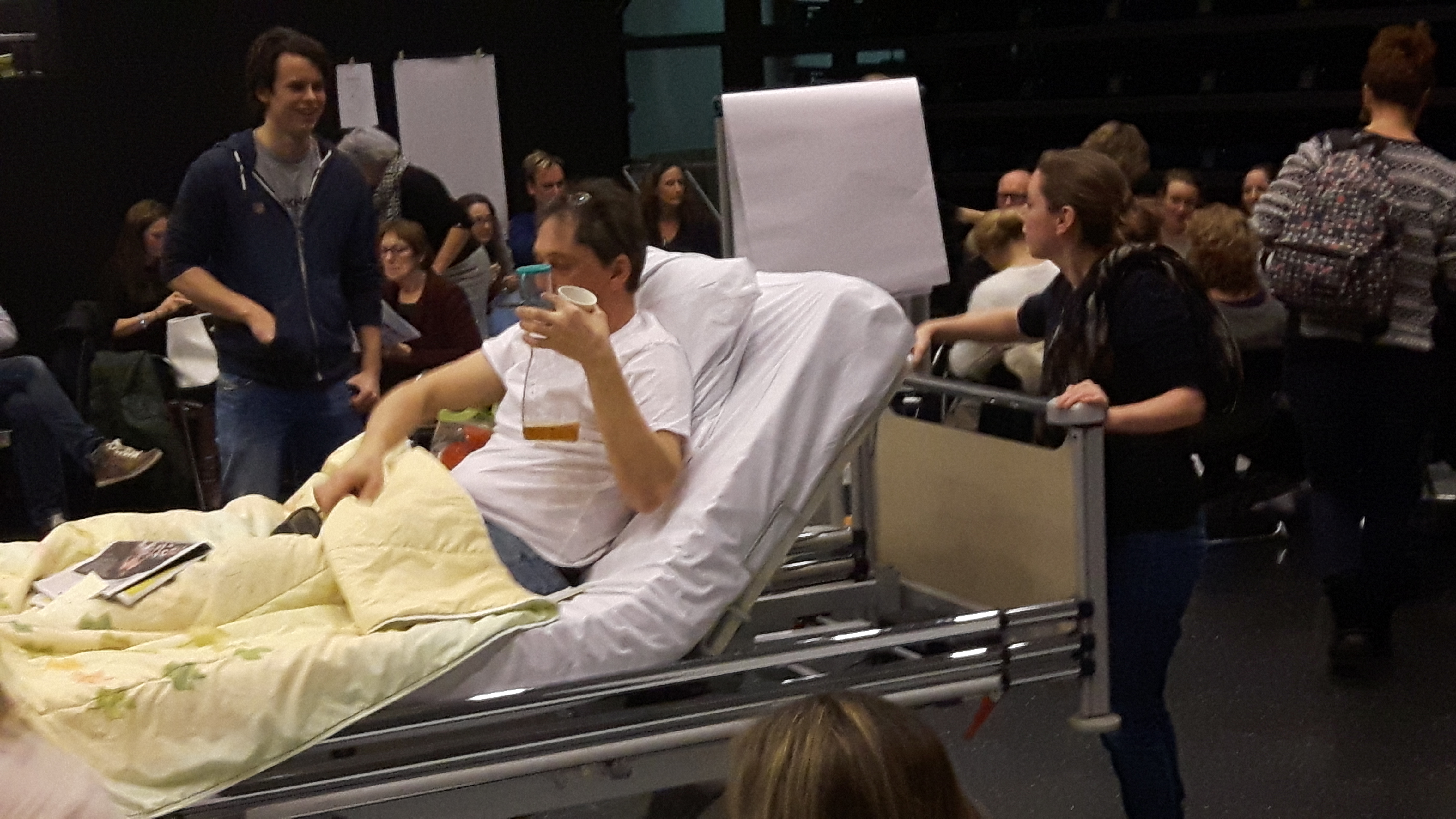 Daarnaast werd er een patiënt met bed en al het auditorium ingerold die door alle teams met de nodige zorg werd omringd. Eindscore voor deze patiënt naast een dosis gezonde aandacht: 4 donuts, 5 appelsap, een bedpan en een fruitmand!